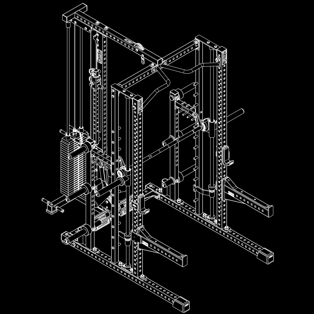 Alle relevanten Langhantelübungen können wahlweise frei am stabilen Rack oder präzise geführt an der seidenweich laufenden Multipresse ausgeführt werden. J-Hooks und Spotterarme sind bereits inklusive und sorgen dafür, dass Sie jederzeit sicher bis an Ihre Grenzen gehen können - für maximale Trainingsvielfalt und Sicherheit. Die integrierte Klimmzugvorrichtung erweitert das Workout um eine Vielzahl funktioneller Übungen. Die integrierte Latzugstation ist mit 125 kg Steckgewichten ausgestattet und ermöglicht alle relevanten Zugübungen von Oben- und Unten - ohne Umbau!