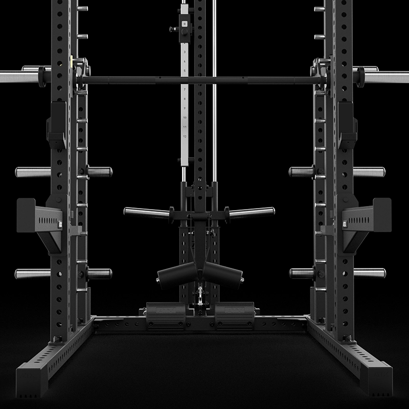 Alle relevanten Langhantelübungen können wahlweise frei am stabilen Rack oder präzise geführt an der seidenweich laufenden Multipresse ausgeführt werden. J-Hooks und Spotterarme sind bereits inklusive und sorgen dafür, dass Sie jederzeit sicher bis an Ihre Grenzen gehen können - für maximale Trainingsvielfalt und Sicherheit. Die integrierte Klimmzugvorrichtung erweitert das Workout um eine Vielzahl funktioneller Übungen. Die integrierte Latzugstation (Hantelscheibenaufnahme Ø 50 mm) ermöglicht alle relevanten Zugübungen von Oben- und Unten - ohne Umbau!