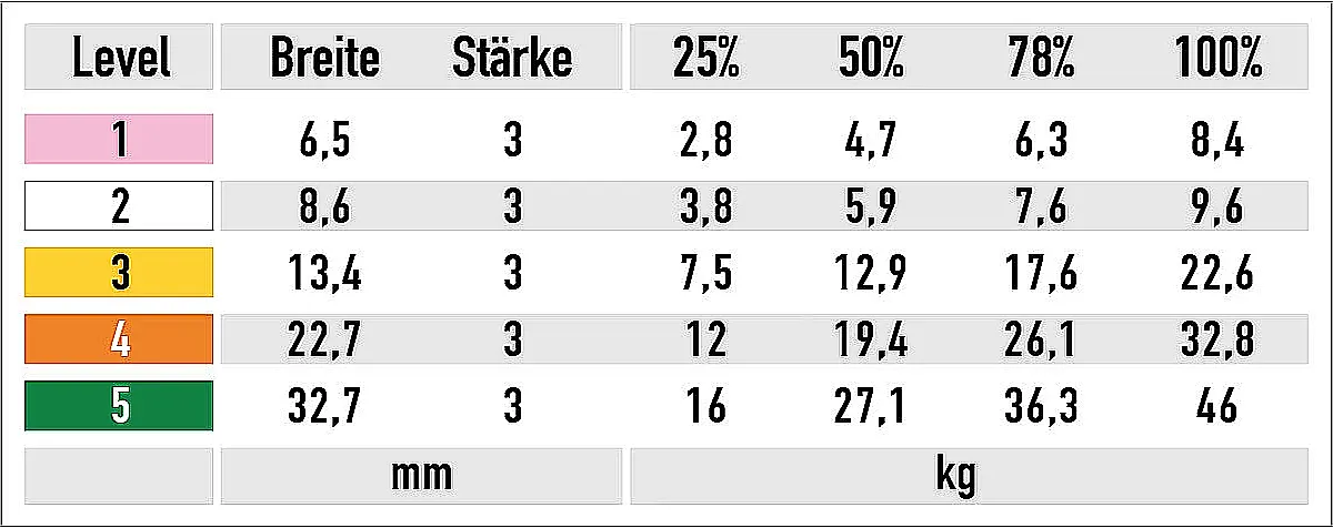 | Widerstandskraft | abhängig vom jeweiligen Widerstandsband - siehe Tabelle in der Produktbeschreibung |
