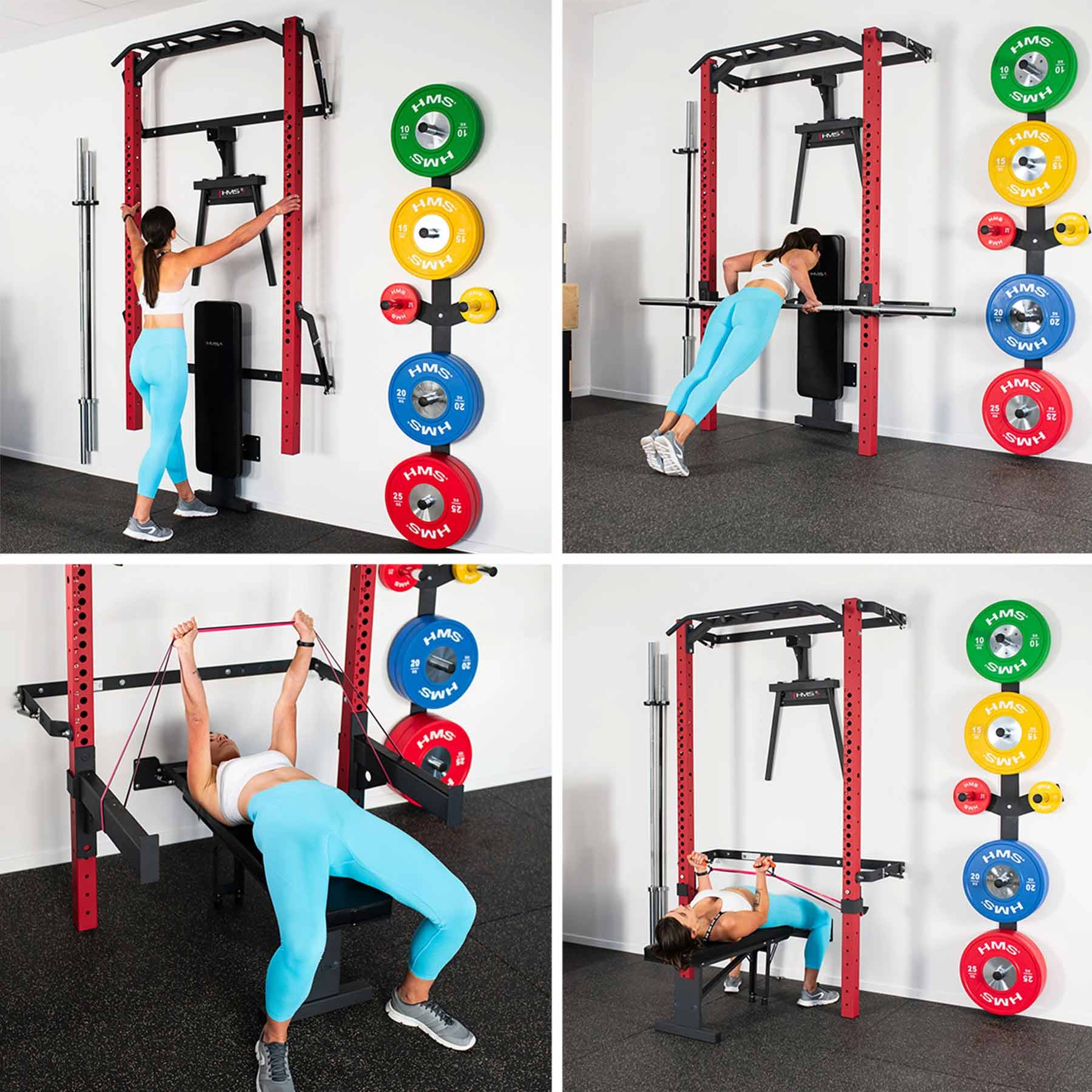 Diese Variante wird inklusive umfangreichem Zubehör geliefert. Neben der Klimmzugstange, Langhantelhaken und Sicherheitsstützen gehören eine klappbare Trainingsbank, eine Dip-Station, eine wandmontierte Gewichtsablage sowie eine Halterung für Langhantelstangen zum Lieferumfang. Das System erweitert das Trainingsspektrum deutlich und schafft gleichzeitig strukturierte Aufbewahrungsmöglichkeiten für die gesamte Ausrüstung.